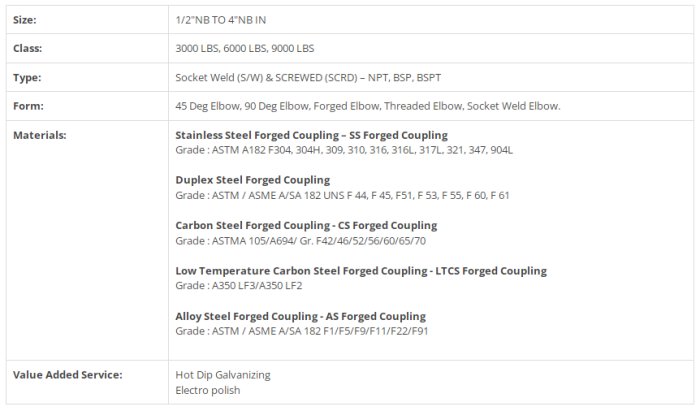 Forged Pipe fittings offered in different choices such as elbow, bushing, tee, coupling, nipple and union. It is available in different size, structure and class with different materials such as Stainless steel, duplex steel, alloy steel and carbon steel. JF engineering is the best supplier of threaded Elbow forged fittings that are designed under the expert guidance. We are highly experienced company in ANSI/ASME B16.11 forged fittings and ensure quality of each product. Threaded Elbow forged fitting has varieties of features such as reliability, durability and dimensional precision. There are lots of advantages of this forged elbow that are easy to install, rugged and corrosion resistant. We are involved in providing a widespread range of forged elbows in different sizes and thicknesses. We are the best in offering different types of elbows such as forged 90 degree elbow, forged 45 deg elbow and forged 180 deg elbow.