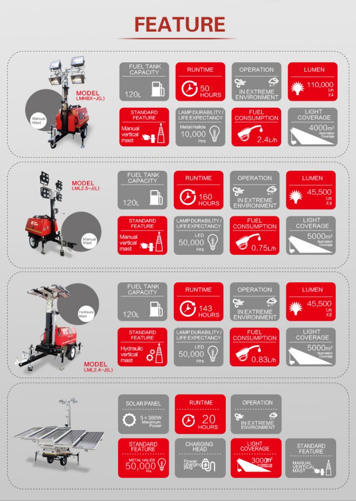 The hydraulic lighting mast is engineered for efficiency and reliability in various outdoor settings. It features a metal halide light source, ensuring robust illumination for tasks requiring extensive lighting coverage. The structure boasts a sleek design and exceptional durability, with impressive seismic resistance and strong anti-corrosion attributes, complemented by stainless steel fasteners. The lighting tower integrates a sound-proof generating set for quieter operations and a waterproof control panel for enhanced protection. It incorporates a dual safety lock system, facilitating secure transportation and easy manual control. Its maintenance is simplified by a wide access area, and it is equipped with an external fuel tank filler and an emergency stop function for additional safety. The mast stands on a two-wheeled trailer with four stabilizers and includes a plastic fuel tank and an exhaust pipe, ensuring mobility and stability in rugged terrains.