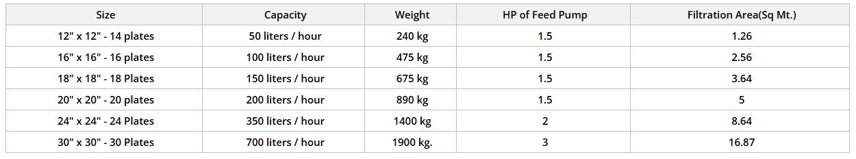 Note: – It is important to note that the filtration capacity of the filter press may vary depending on the type of oil, viscosity of oil and the % sediments (solid particles) contained in oil.