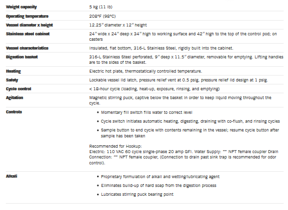 Simple to operate. 5 kg (11 lb) capacity. Digests mice, rats, hamsters, rabbits, guinea pigs. Easy to install and move. Safe and economical operation. Ideal for small labs and clinics.