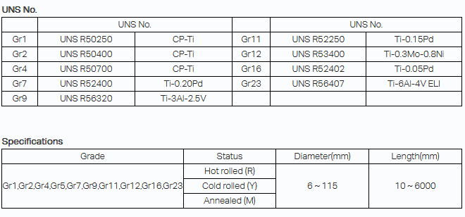 Titanium bar are divided into pure titanium bar and titanium alloy bars. For pure titanium bars we mainly provide Gr1, Gr2, Gr4 and other grades; we provide titanium alloy bars of Gr5, Gr7, Gr9, Gr11, Gr12, Gr16, Gr23 etc.
