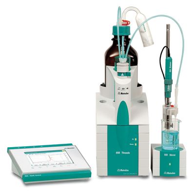 High-end titrator with built-in buret drive: Including 900 Touch Control, 801 Stirrer magnetic stirrer, exchange unit (20 mL) and combined "Ecotrode plus" pH glass electrode, dynamic (DET), monotonic (MET) and endpoint titration (SET), four MSB connectors, one galvanically isolated measuring interface (also for intelligent "iTrodes" electrodes), USB connector.