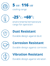 Easy to apply and maintain with long-lasting modular and compact design. ISCA Air Cooled Type Self Contained units with their compact, durable, robust and attractive cabinet fit any working environment such as dusty and corrosive. These units can be used in steel and metallurgy, mining, cement, oil&gas, machinery, energy, marine and defense industries. These units operate with environmentally friendly refrigerants. Various compressor and refrigerant type usages brings trouble-free operation with high ambient temperatures up to 60°C`s. Heating can be carried out with electrical heater, steam, hot water and thermal oil resources.