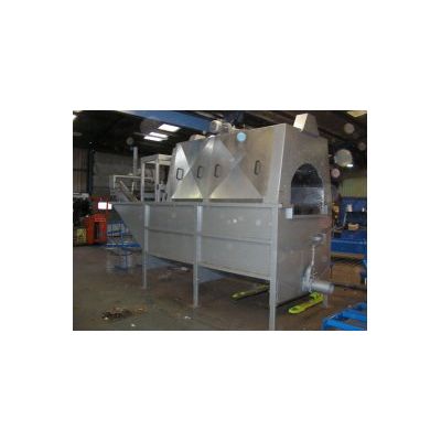 Tong Washer. Fully rebuilt. 1.2m diameter x 2.5 long barrel, shaped bottom tank with lever operated gate valve with flushing pipe in the feed out end of the tank. Electric opening on barrel door. Stainless steel barrel with large diameter powered brush.