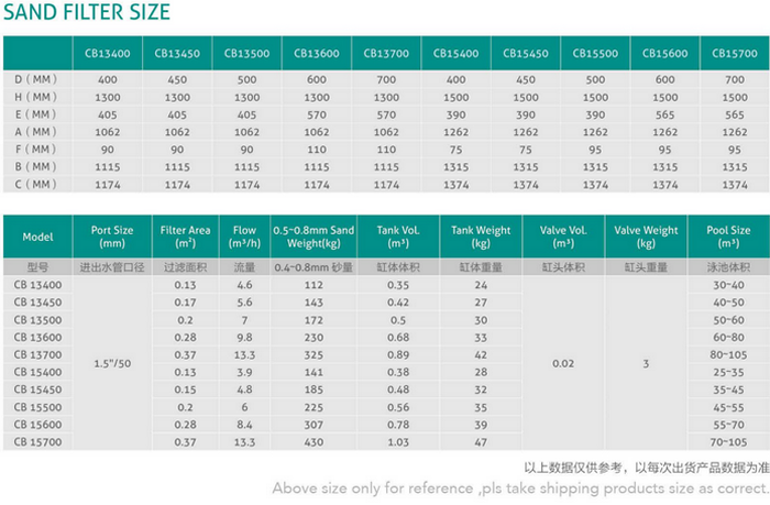 - Sand filter maximum working pressure:2 .5Kg(250Kpa/36psi/2. 5bar),the maximum pressure test is 4Kg(400Kpa/58psi/4 0bar).Can be produced according to specify different color, different