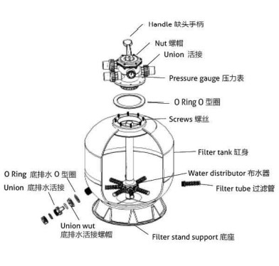 • Sand filter maximum working pressure:2 .5Kg(250Kpa/36psi/2. 5bar),the maximum pressure test is 4Kg(400Kpa/58psi/4 0bar).Can be produced according to specify different color, different