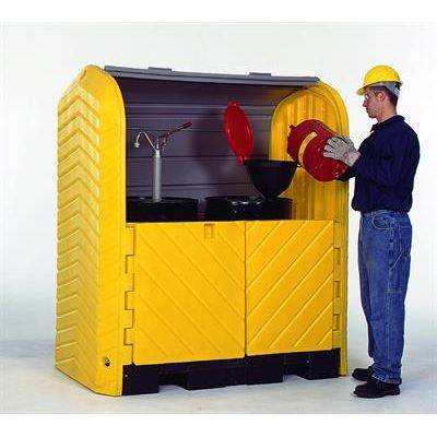 Ultra Hard Top P2 Plus Spill Pallet 2 Drum Storage - With Drain - Store Hazardous Drums Safely Outdoors with Pumps and Funnels In Place. Tall 3/4" head space easily accommodates rotary drum pumps and large conical funnels. Low profice ( 8 3/4") containment pallet positions drum-top funnels at a safe, convenient level to pour hazardous wastes. 100% polyethylene construction will not rust or corrode. Meets SPCC, EPA Container Storage Regulation 40 CFR 264.175, and UFC Spill Containment Regulations. Helps meet Stormwater Management Regulations - NPDES, 40 CFR 122.23 (1999).