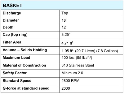 - Solid Decanting Basket: 316 Stainless Steel, fully machined and dynamically balanced. Options available: skimmer siphoning tube
