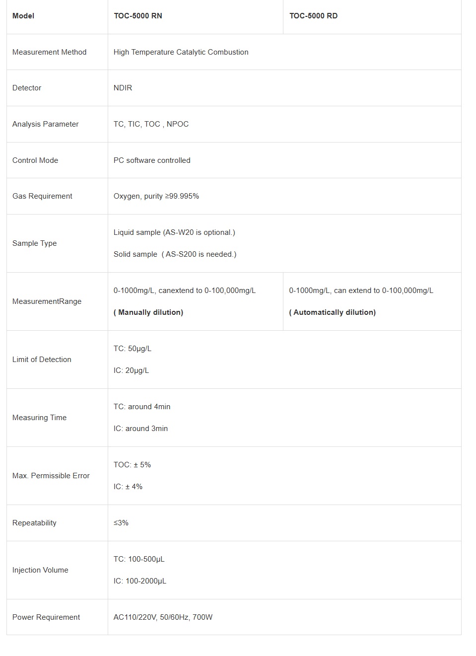 - Auto sample dilution, auto acid-adding and auto gas purging (Only TOC-5000 RD).