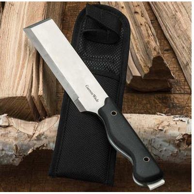 It’s the ultimate hybrid, incorporating features of a knife, chisel, hatchet, cleaver, pry-bar, and rescue tool. It’s a jobsite or campsite Do-Everything Tool. The high carbon steel blade is 6" long, 1½" wide and a stunning 1/8+" thick all over. Total length is 11 1⁄4". It has an extended butt for striking, a wide exposed spine, a G10 handle and a nylon sheath. It’ll take a beating – nice to have on hand.