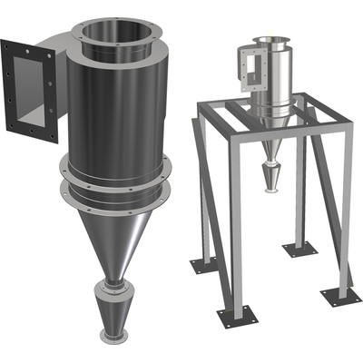 The Aerodyne Model TR traditional cyclone allows the collection of larger particles in an airstream when installed before a baghouse, cartridge collector, or wet scrubber. The model TR cyclone will remove larger dust particles that could plug up or damage filters. It will also lower the dust loading going into the filters or wet scrubber, thereby extending the life of the filters, lower plant air (compressed air) usage, or minimizing the slurry required to be treated from the wet scrubber.