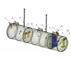 The plant consists of two or three chambers. First, surface wastewater passes to the first chamber where the flow of wastewater is settled. If the separator is integrated with sand-catcher, the sand and dirt deposit in the first chamber. From first chamber the wastewater passes to the second chamber with coalescing filter, where oil products bind into larger drops and rise to water surface more quickly. NGP and NGP-S type plants are equipped with absorption filters that keep back fine drops of oil products and partly dissolved organic substances (of surface activity).