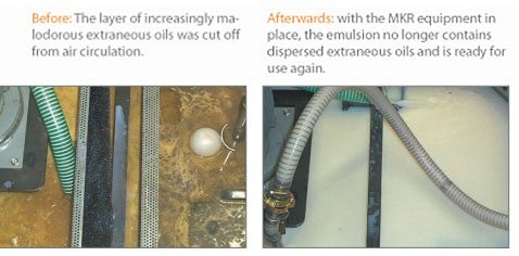 We apply the coalescence principle to separate out extraneous oils. In the process, the rising light oil fraction of extraneous oils is skimmed from the surface using a floater. This fraction is then carefully transferred to an interim processing container. A special coalescence packet recovers dispersed oil droplets from the emulsion and returns them as clean and effective coolant back to your machine.