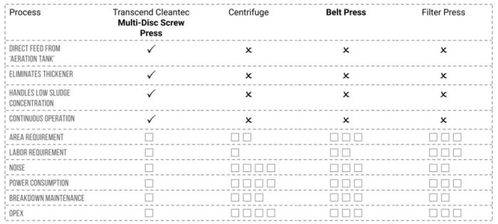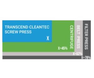 The Transcend Cleantec Screw Press takes the least space among other technologies. Its approximately 45% less space than Centrifuge, 62% less space than Belt Press and 78% less space than Filter Press of conventional design.