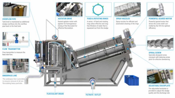 The sludge is transported from the thickening zone to the dewatering zone by the screw conveyor The spiral conveyor in the screw cylinder is specially designed to move the sludge forward efficiently while gradually compressing them by pushing the sludge against the back plate. As the sludge is compressed, most of the water is squeezed out of the sludge. The squeezed out water from the sludge is filtered by the series of fixed and moving rings. Clear water flows to the filtered water tank below. The dewatered sludge exits from the outlet at the top and falls down. The constant rotation of the screw ensures the sludge is pushed forward, thickened, dewatered and exited while filtering the water, all at the same time