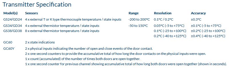 GS24 and GD24: 4 state inputs (or K/T thermocouples -200 to +200°C), e.g. door open/close. GS34/GS38 and GD34/GD38: 4 / 8 state inputs (or thermistor), e.g. door open/close.