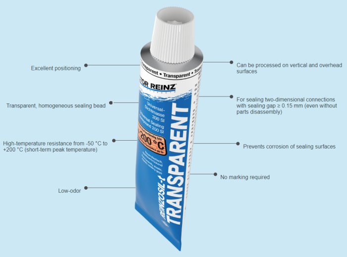 REINZOSIL-t is the transparent version of REINZOSIL and is especially ideal for sealing surfaces with visible sealing joints. REINZOSIL-t is resistant to gasoline and diesel fuels, biodiesel, oils, greases, lubricants, water, seawater, sunlight and ozone. High-temperature resistance from -50 °C to +200 °C (short-term peak temperature).