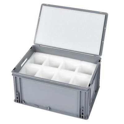 Transport containers with label holders for secure transport and practical storage of 8 DIN sample bottles containing 1 l or 2 sample bottle containing 2 l. The containers FTB 1/8 and FTB 2/6 are lightweight and stable and thanks to the standardized sizes, they provide simple and space-saving storage. The inserts for the 1 or 2-liter bottles provide insulation and a firm stand.