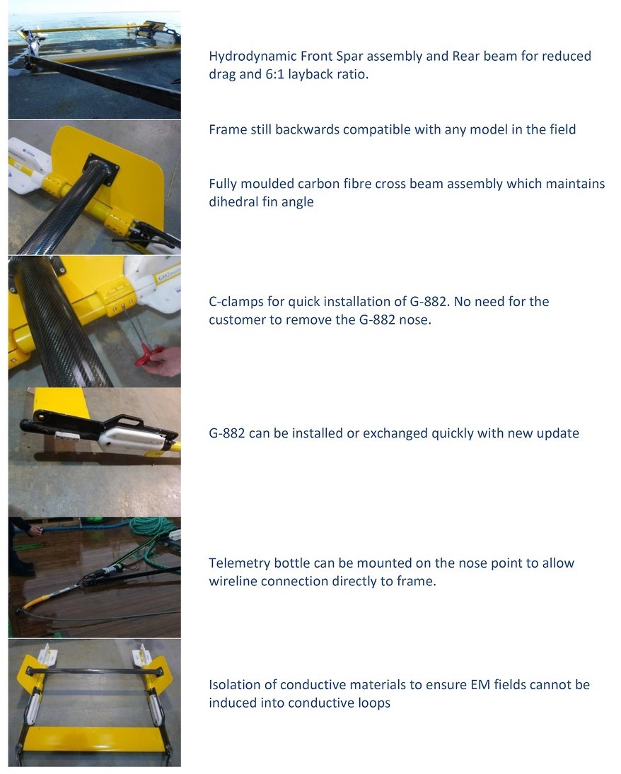 In addition the tow assembly offers the operator the option to install a USBL beacon onto the frame, improving the operator’s confidence in controlling the position and depth of the frame, which is particularly important when deploying two frames simultaneously. Field tests indicate the sensitivity of the G-882 magnetometers is not impacted by the placement of of a telemetry bottle and USBL on the tow assembly.