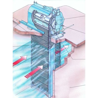 Automatic band screen or traveling band screen with a mesh size from 0,5 mm to 10mm, that is designed to remove all fine solids (algae, plastics, leaves, jellyfish, branches, etc). Each band screen is comprised by a head section, a set of guides and a series of chain-linked filtration baskets. Heavy duty design, with unitary flow from 1.000 m³/h to 150.000 m³/h. It can be designed to comply with very strict material specifications. Optionally, it can include a fish protection system