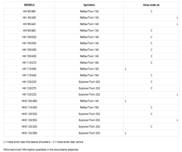 CONSTRUCTION SPECIFICATIONS – high strength “medium density” polyethylene Pipe with differentiated thickness; – high efficiency hydraulic turbine included in the gearbox/transmission; – motion transmission to the drum through the coupling of the pinion with a large diameter ring gear; -emergency PTO input with the help of the cardan shaft on the tractor; rotating turret, by using large diameter rotational bearings housed between the fixed lower frame and the upper one; – locking pin turret release device; a device guides a worm gear tube for an optimal backward; mechanical safety device against any wrong overlapping of the pipe while rewinding, with automatic stop of the cycle; a by-pass valve controls the speed of return with hydraulic and manual control; – automatic stop of the cycle when the sprinkler cart is completely retracted; -galvanized frame; -water path and accessories in galvanized steel; -sprinkler trolley; -sprinkler; – safety devices in accordance with the EU requirements.