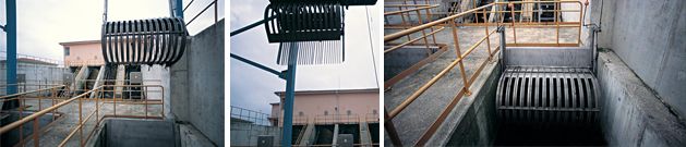 The travelling grab rake is automatically or manually stopped over each screen group and lowered onto the screen in open position by the built-in lifting device. The screenings accumulated on the screen are collected by the grab rake that closes when it reaches the bottom of the screen. The grab rake full of screenings is lifted to ground level by the lifting device and it travels to a waste container where it discharges its contents.