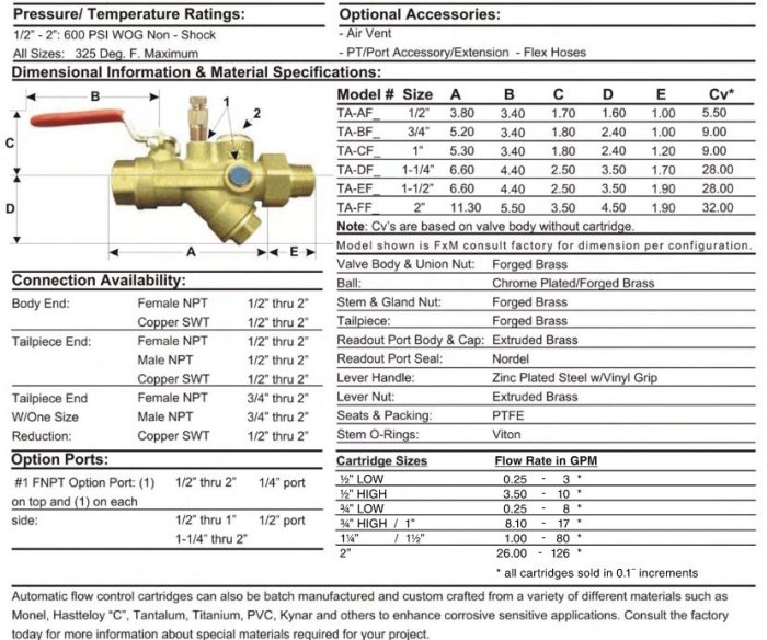TRI AUTO FLO ; MECHANICAL SPECIFICATION AND ORDERING FORM; Tri Auto Flo is a combination isolation Valve, Union, Pressure and Temperature port which is equipped with a Tri Auto Flo cartridge, which is capable of maintaning the flow within +/- 5% of actual flow rate between 2-50 PSID differential pressure across the cartridge. The Tri Flo forged brass body insures multiple taps, reliable leak free performance and additional accesories to accomodates variable piping configurations. Tri Flo Tech is capable of manufacturing the cartridges to maintain the flow to decimal increments such as 1.1 G.P.M., 1.2 G.P.M. thru 1.9 in all flow rates. Please Remove the cartridges from line when flushing the system.