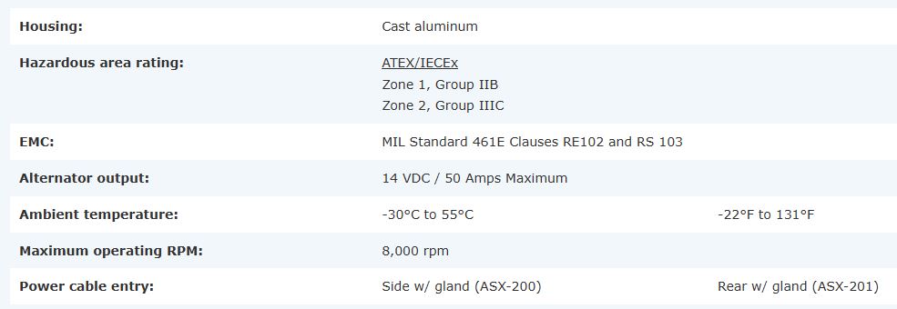 The ASX-200 12VDC/50Amp Flameproof Alternator is an externally excited alternator designed for use in belt driven, diesel engine applications. The ASX-200 is tri-certified for use in hazardous areas classified as ATEX/IECEx Zones 1 or 2, NEC 500 Division 2 and NEC 505 Zone 2. It is suitable for ambient temperature range -30°C to +55°C.