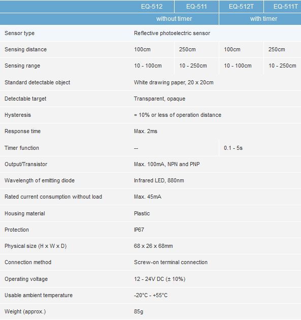 The EQ-500 series is a reflective photoelectric sensor with a compact design. Background and foreground suppression (DC types) and a long sensing range of up to 2.5m is characteristic of this sensor. Even in harsh environments prone to water or dust stable sensing is possible.EQ-500 series can be used to confirm the passage of packages on a conveyer belt or detect people in front of automatic doors.