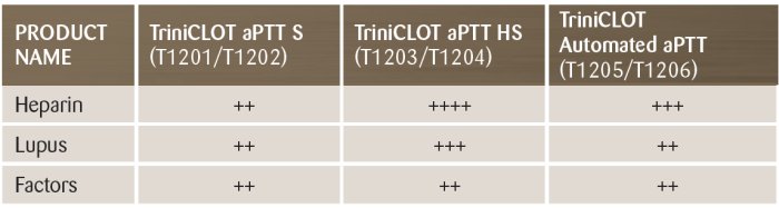 - Second line reagent: TriniCLOT aPTT HS has a higher sensitivity to lupus and is therefore adapted for use as a second line reagent. It is also appropriately sensitive to deficiencies of all intrinsic factors and can be used for the monitoring of unfractionated Heparin.