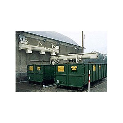 Troughed conveyor system to discharge marc, with horizontally-installed collecting screw and mobile distributing screw above the containers.