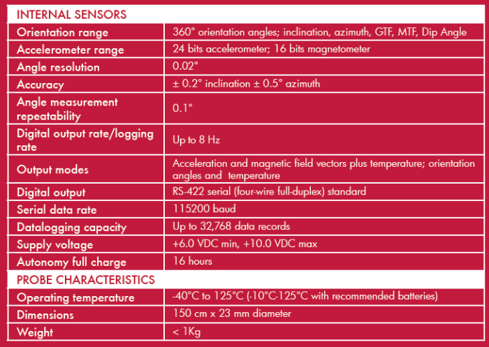 The new inclinometer carbon probe allows to perform a set of measurements of direction and inclination of boreholes in 3D space. The new carbon fiber body makes it light and easy to handle in difficult contests, for both horizontal and vertical boreholes, till 30mm diameter width. Instantaneous visualization of results acquired along borehole, showing its altimetric and planimetric trend with respect to the initial position for a fast and accurate crossing borehole positioning.