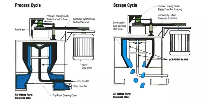 A vertical “scraper bowl” two-phase separator is different. In this high-performance design, the bowl is designed to retain the solid material during the “process cycle.” Solids-bearing liquid is introduced into the spinning bowl by a feed pump. It accelerates to match the vessel’s speed, at which time centrifugal force drives the solid particles out of suspension in the liquid and holds them against the bowl walls. The clean liquid then drains away out of the bottom of the vertical centrifuge. Periodically, the feed pump is shut off (preventing new solid-laden liquid from entering the bowl). The “scrape cycle” begins: A blade is brought up against the bowl’s interior, collecting all of the captured solids.