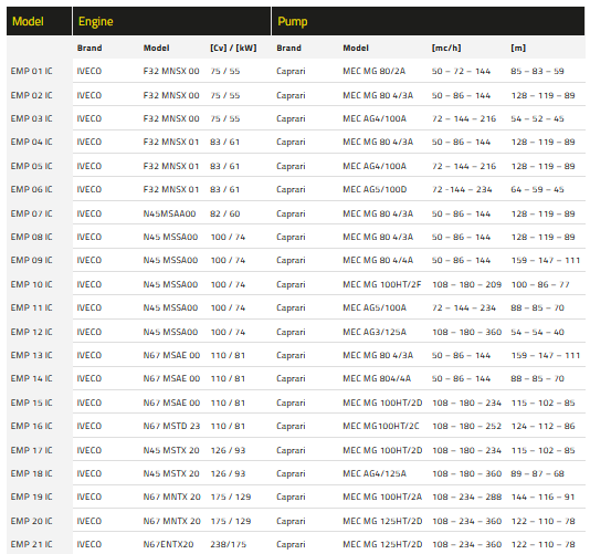 - Diesel engine pump flow rate: from 50 to 360 m3/h