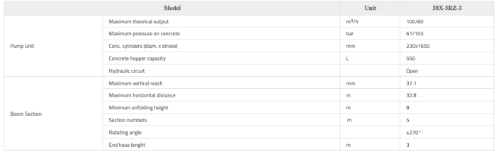 This is a 38m truck pump with pumping high-volume concrete. Max. pumping output is 160m³/h, meaning high construction efficiency. 5RZ boom with high placing flexibility.