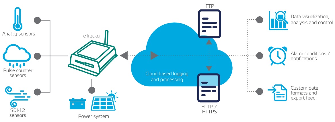eTracker is the gateway between sensors and the cloud. Data communication and IT infrastructure are merged under one user interface experience. eTracker was designed from the ground up to embrace the current and future trends of cloud-based remote data acquisition and the “Internet of Things” (IoT) revolution. This paradigm shift centralizes all the historically isolated processes of remote configuration, programming, logging, and telemetry. Configuration, logging, data processing and analysis is now done in the cloud, eliminating time and cost in programming and maintaining expensive, complex data loggers and communication devices at each remote location.