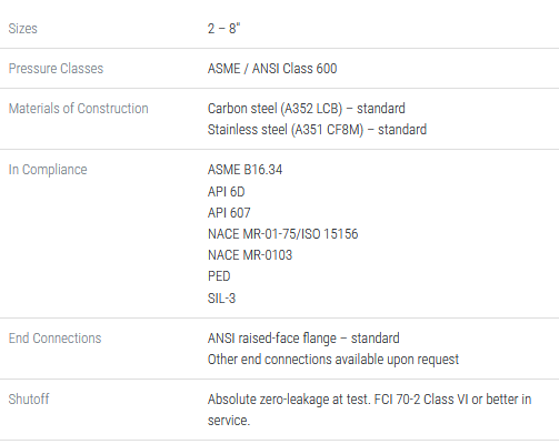 - Fire safe certification: API-607. Benefit: Enhanced process safety