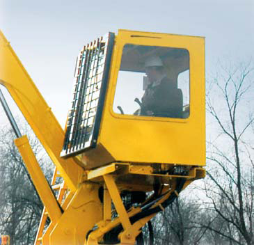 Ergonomic cab enclosure and cab controls. The optional loader cab pivots with the loader, allowing greater visibility and reducing operator movement during normal working conditions. Filtered and pressurized incoming air, heater, and air conditioner provide greater operator comfort. Once the machine is started from the ground control station, virtually all operations can be controlled from the cab.