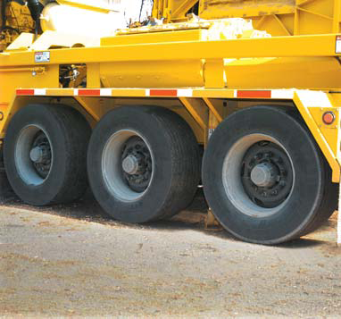 Ground clearance. A tandem or triple axle suspension with super single tires provides flotation and 11" (28 cm) of ground clearance for better transport and movement in areas where soil conditions are unstable. The enhanced clearance also provides protection of components under the machine, such as brake canisters and axle components, by keeping them up and out of the way of debris that is commonly found on jobsites.