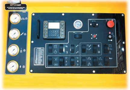Control panel. The control panel display of the microprocessor and CAT engine systems, provides real time performance data. The control panel also provides full instrumentation and diagnostic gauges for monitoring hydraulic systems and troubleshooting. The panel is located under the Falling Object Canopy, which helps protect the operator from falling debris.