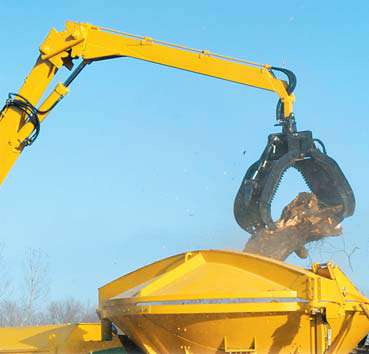 Optional loader. With a 27` (8.2 m) reach and continuous rotation multi-tine grapple, the loader has the ability to lift up to 3,500 lbs (1,588 kg) at full reach.