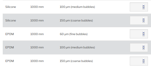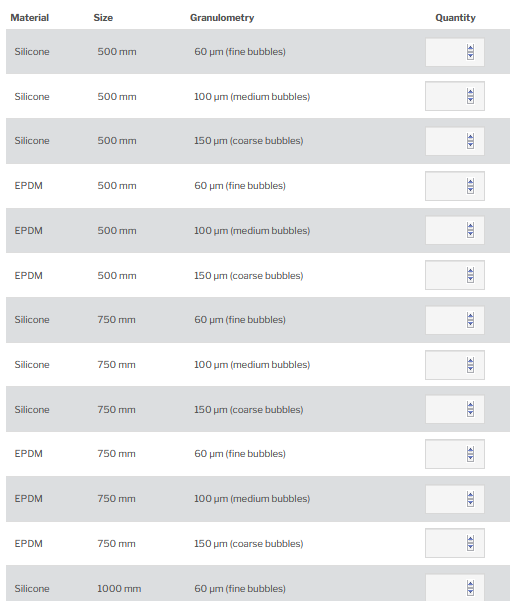 As Geotierre, we produce tube diffusers with ¾” screw connections for nipples (TBA series) or tie-rods screws (TBX series). Although the standard length of the tubes is 500/750 mm, made to measure lengths can be requested. The raw materials used for the construction of our diffusers come from major European groups and thus we can guarantee reliability over time. The membranes are available with different porosities (small, medium or large bubbles) in order to accommodate every need.