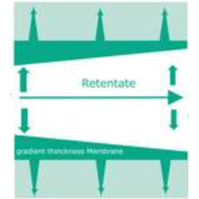 The ISOFLUX™ membrane allows obtaining a constant permeate flux on each point of the membrane without using a complex and expensive system. To obtain this result the thickness of the separating layer decreases from the inlet to the outlet in order that the ratio pressure/thickness of the layers stays constant.