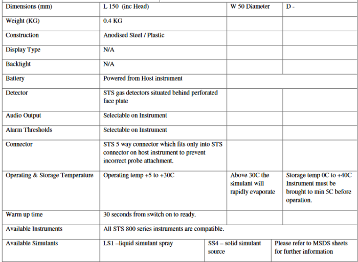 The STS 44A is a replica of a real 44A probe , but with a STS gas detection head rather than a real detector. STS electronics installed within the host instrument power the gas detection system and the signal generated is displayed on the host instrument as counts. The Probe detects the presence of the STS LS1 liquid simulant spray placed on surfaces and clothing.