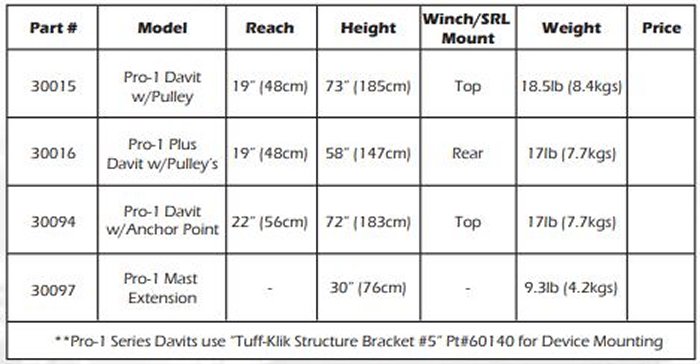 The Pro-1 Series Davits are designed to be small and lightweight, while at the same time being strong, reliable, and providing economical packages. The Pro-1 Series Davits also FOLD UP for easy moving and storage.