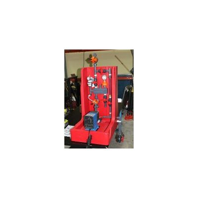 The system can be built into a self contained system complete with valves, relief valves, back pressure regulators and calibration columns. Suction can run through fittings in the bottom of skid to tank or tote below. Relief would follow the same path.