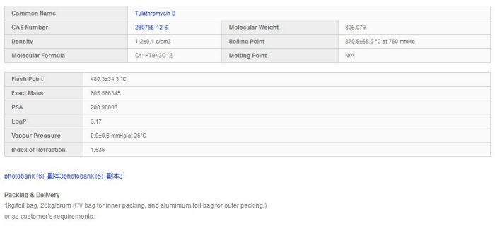 Common Name Tulathromycin B CAS Number 280755-12-6 Molecular Weight 806.079 Density 1.2±0.1 g/cm3 Boiling Point 870.5±65.0 °C at 760 mmHg Molecular Formula C41H79N3O12 Melting Point N/A Flash Point 480.3±34.3 °C Exact Mass 805.566345 PSA 200.90000 LogP 3.17 Vapour Pressure 0.0±0.6 mmHg at 25°C Index of Refraction 1.536 Packing & Delivery 1kg/foil bag, 25kg/drum (PV bag for inner packing, and aluminium foil bag for outer packing.).
