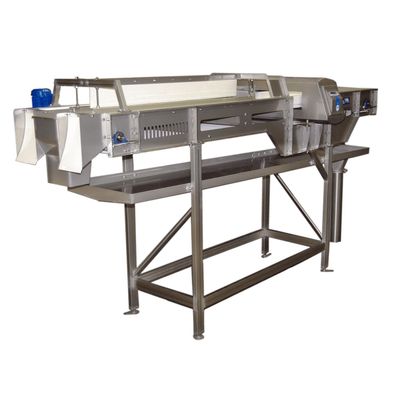 The Tummers inspection conveyor belt allows for a final visual check on the products before they undergo further processing. Sub-standard potatoes and foreign objects can be removed by hand. If required, the Tummers inspection conveyor belt can be expanded with a centre rail for sub-standard products, discharge funnels, discharge conveyors, metal detectors and a platform.