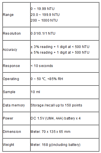 Microprocessor based for fast and accurate measurements. ISO 7027 measurement method. Large LCD 45 x 25 mm display for reading convenient. Unit NTU, FTU, EBC are changeable. Memory function stores and recalls up to 150 points. Low battery alarm and auto shut off after 10 minutes of non use.