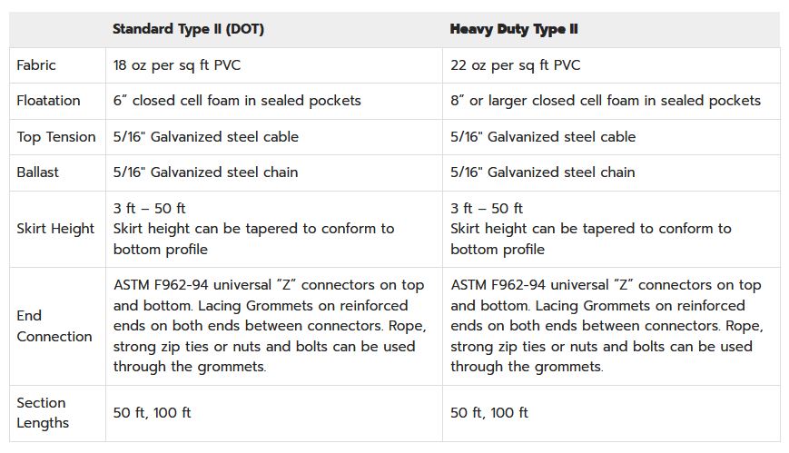 Type II turbidity curtains (also commonly referred to as Type 2 and silt curtains) are intended to control sediment and runoff in slow-moving waters. These turbidity curtains are built with foam-filled floats that are referred to as Freeboards, combined with skirts that typically range in height from 5 to 50 feet. These floating silt curtains impede the flow of silt or sediment that may be suspended in the water.